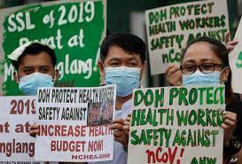 Health workers stage a noise barrage protest in front of their hospital in Manila. FILE PHOTO Members of the Alliance ...