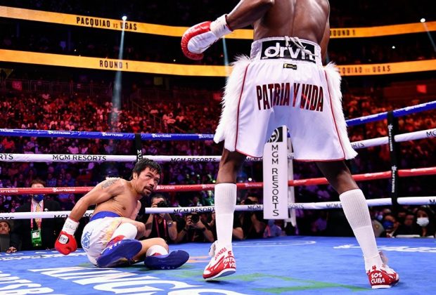 Manny Pacquiao of the Philippines (left) looks at Yordenis Ugas of Cuba after being knocked down during the WBA Welterweight ...