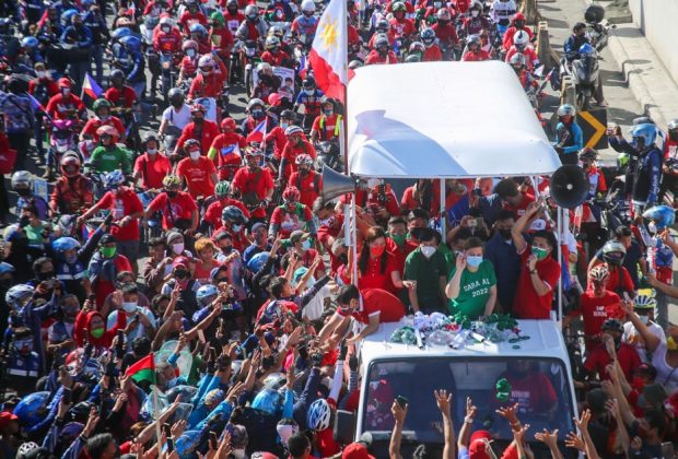Presidential aspirant Ferdinand Marcos, Jr and running mate Davao City vice mayor Sara Duterte distribute campaign paraphernalia during the team’s ...