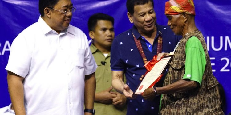 President Rodrigo Duterte hands a Certificate of Land Ownership Award to a beneficiary at Lagao Gymnasium in General Santos City. More than 20,000 hectares of agricultural land were distributed in Soccsksargen that day. (PCOO photo)