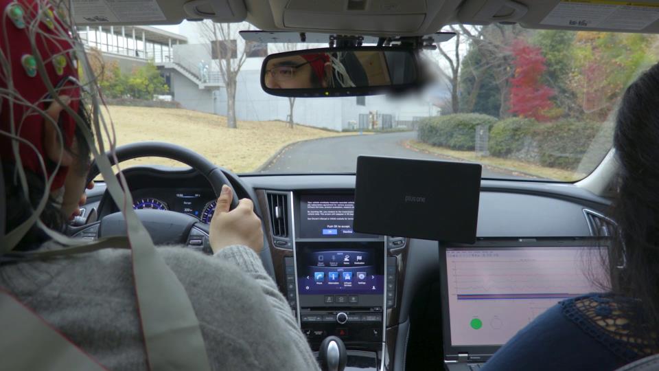 It functions by having a driver wear a headset that reads impulses from his brain. (photo from Nissan)